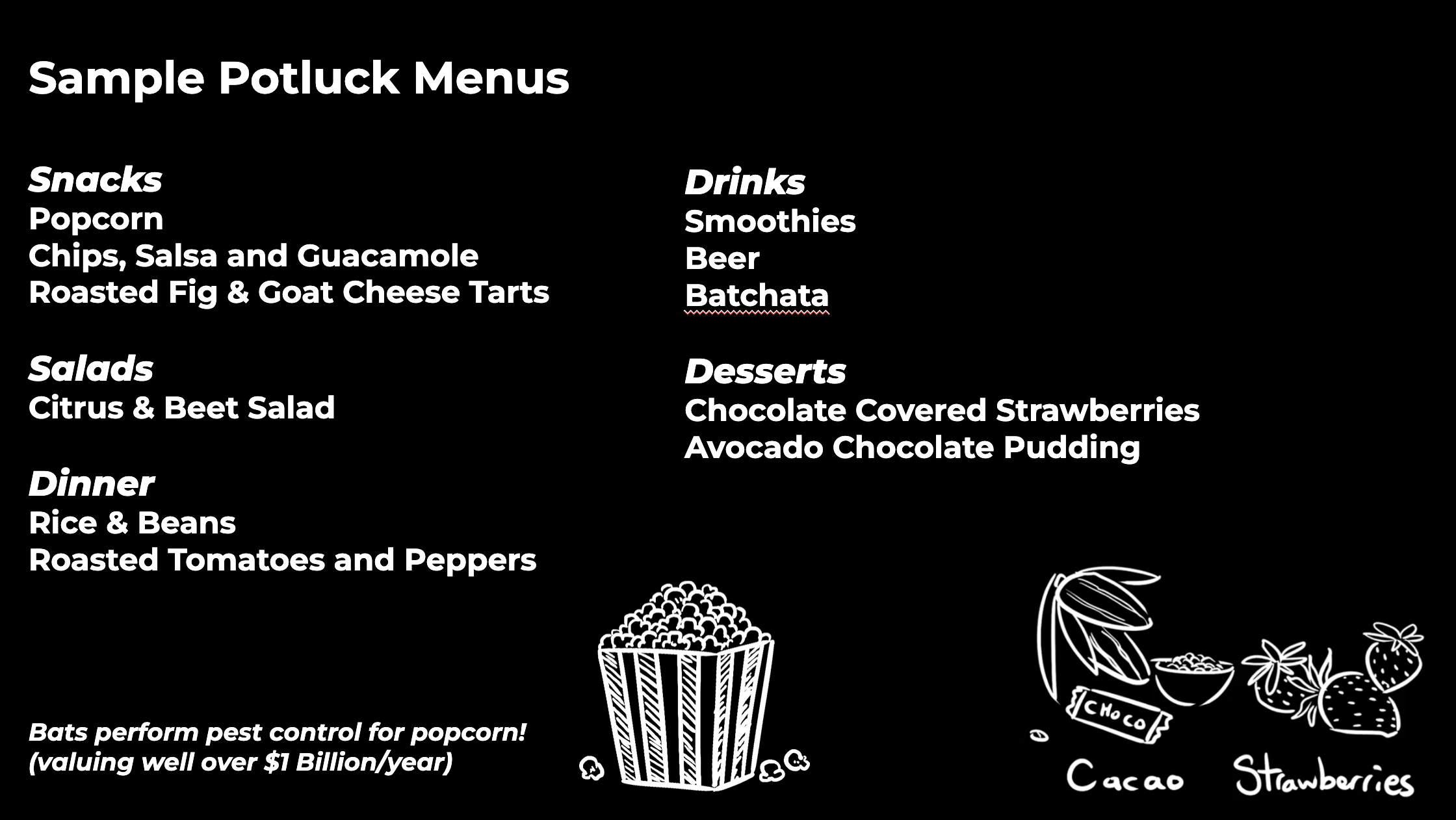 If it is a potluck - divide up your menu and get them already thinking about how bats influence our food supply.